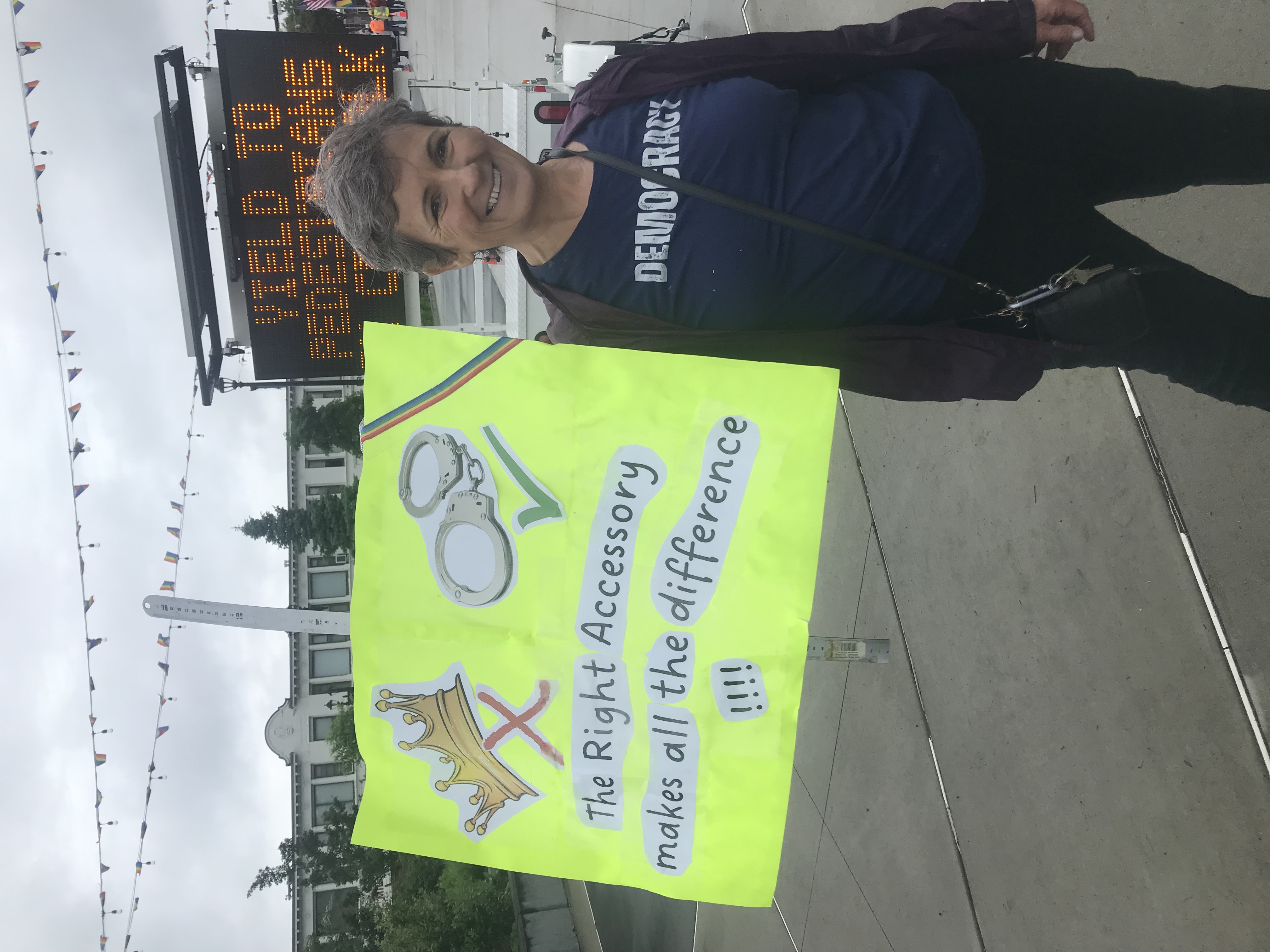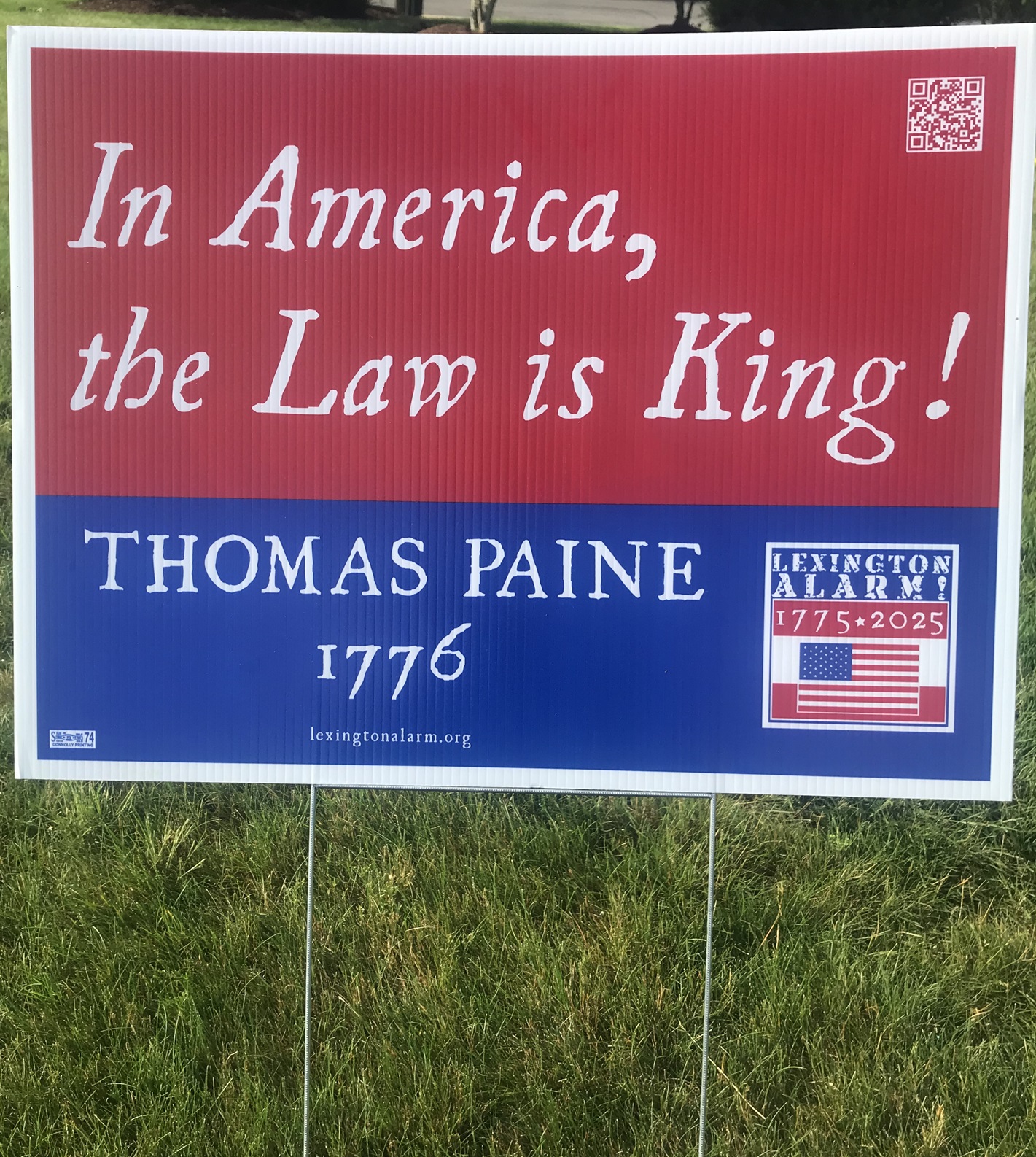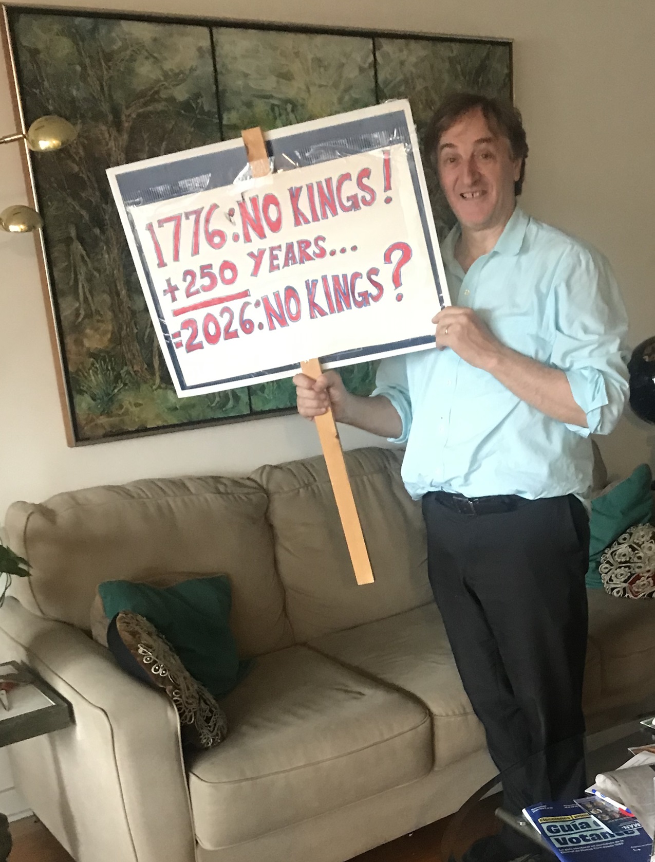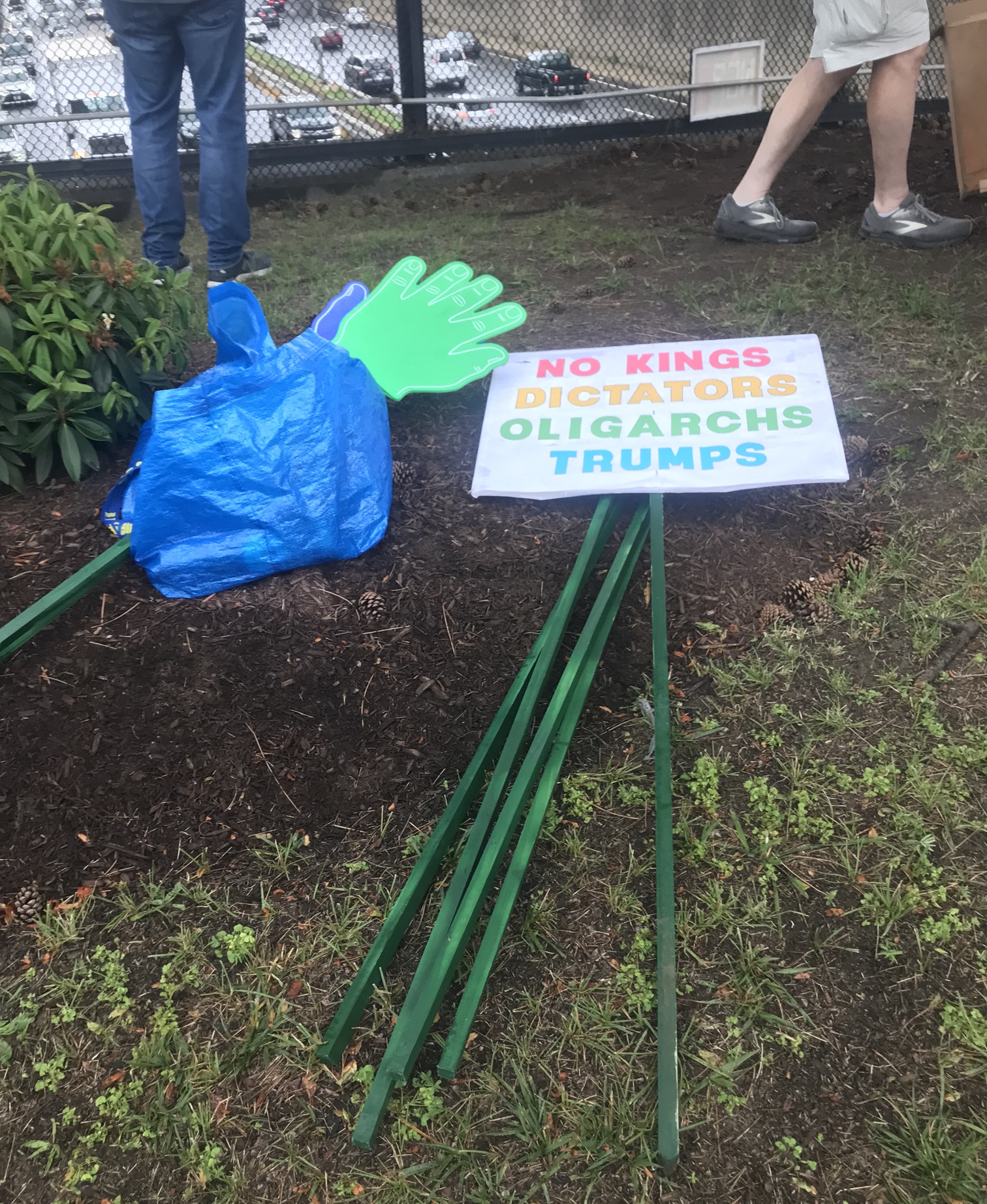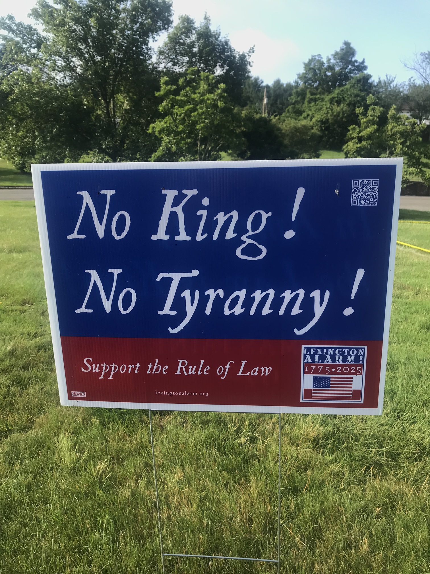 Over five million people attended over 2,000 rallies nationwide on June 14, including in Milton. Some of them had nicely-printed signs, but I think the hand-made signs say a lot more. My sign, to the right, says "1776: No Kings! +250 years 2026: No Kings?". Here's a sample from the I-93 overpass at East Milton Square...